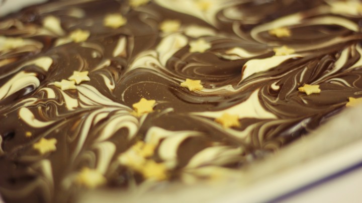- With a cocktail stick, swirl the white chocolate until it creates a marble effect. There are no rules to this bit.