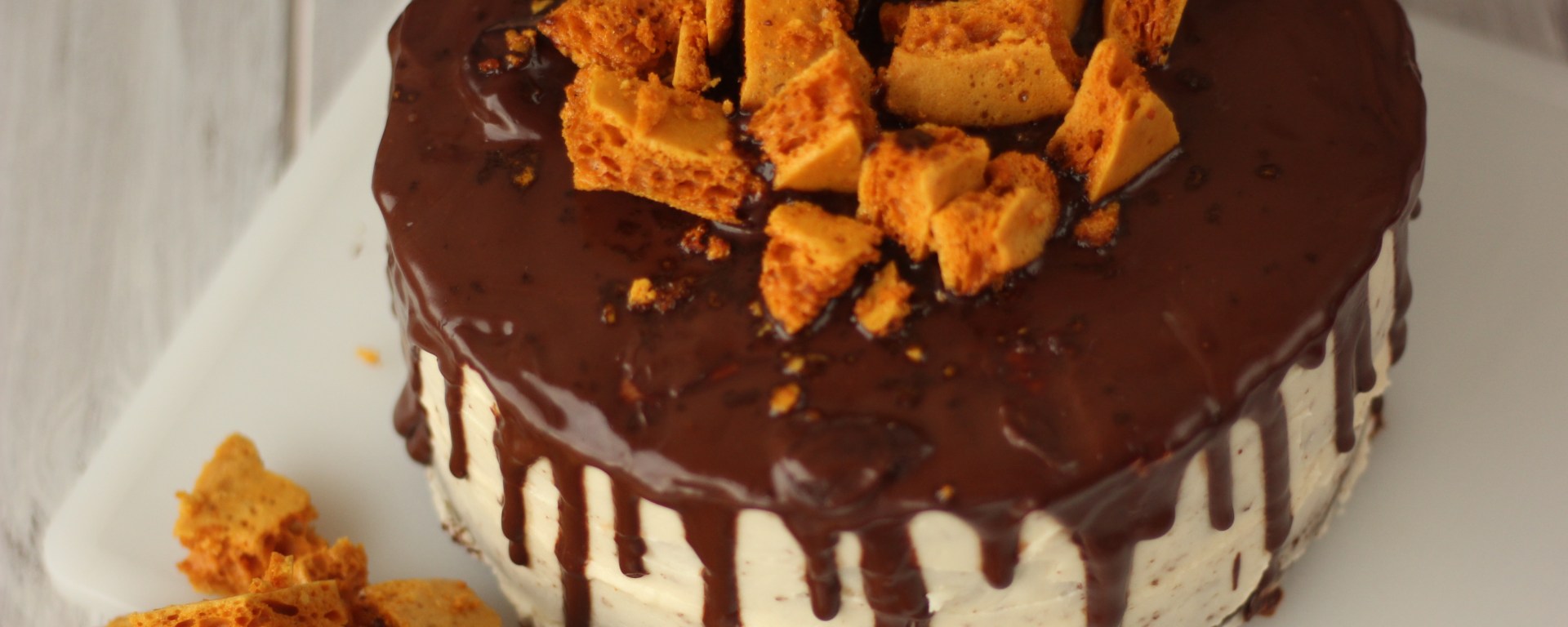 - Crumble, break and place chunks of honeycomb onto the cake.