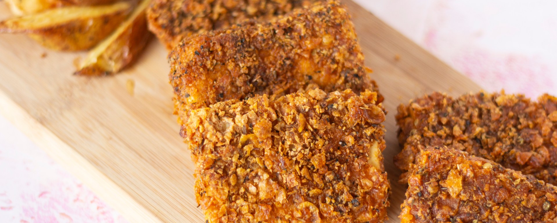 - Coat each piece of tofu with the flour mix, then dip it into the milk/flour/spice mix. Finally, Coat the tofu evenly with the breadcrumbs.