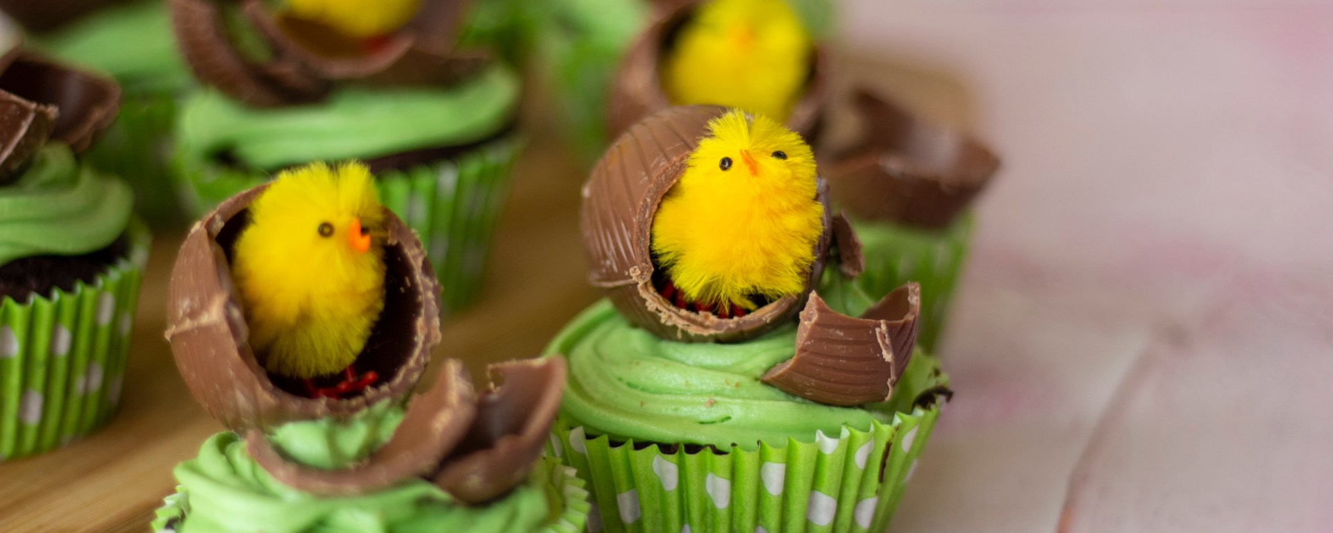 - Place the eggs on top of the buttercream topped cakes. Place the mini chick decorations inside the eggs to make them look like they’ve hatched.