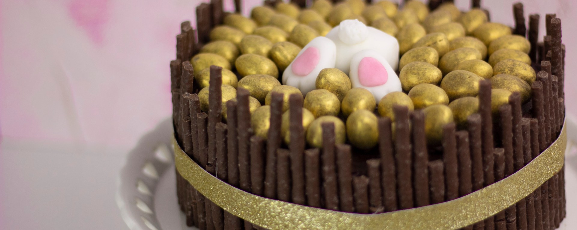 A 2 layer gluten free chocolate sponge with chocolate ganache, decorated with golden mini eggs and Matchmakers.