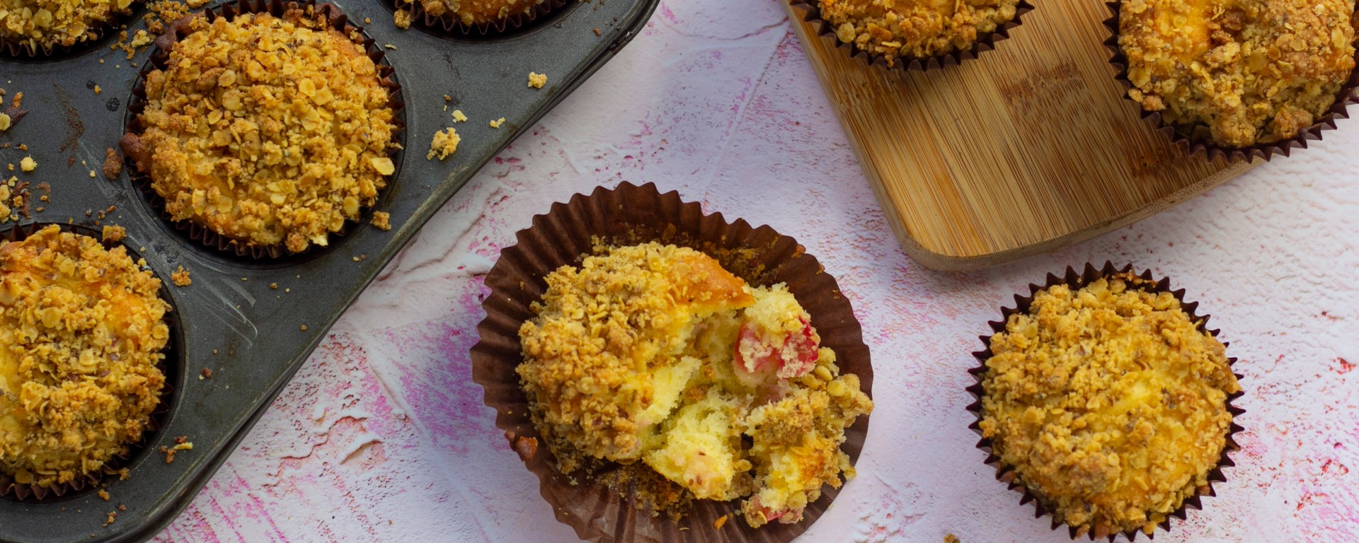 As summer approaches, recipes featuring seasonal fruit and veg are in abundance. One of my favourites is rhubarb! I love making crumble with it. But not everyone is keen on a lovely Crimble-crumble. So what can you do? Make Muffins of course! Filled with lovely tangy chunks of fresh rhubarb, these have a gluten free oaty topped sweet crumble baked on the top, so all of the family can enjoy! Check out my recipe below.