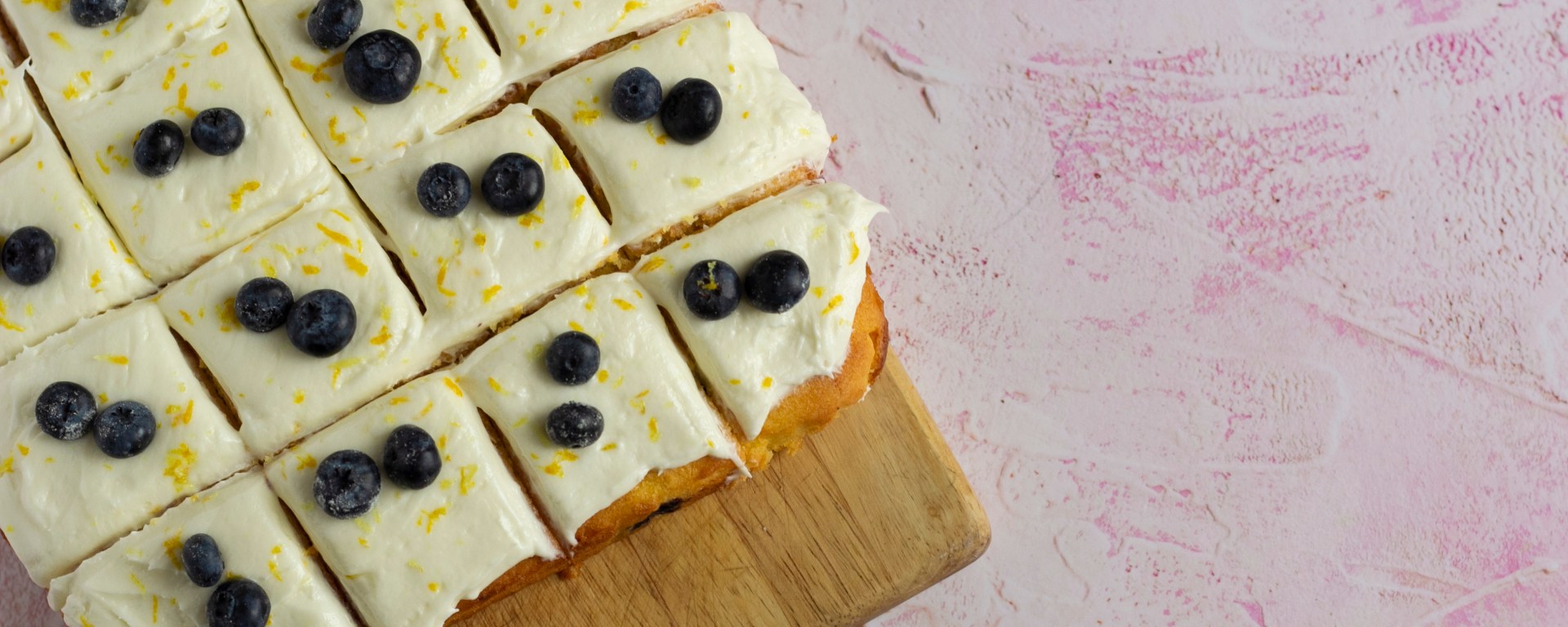 A light and fluffy lemon traybake with blueberries and cream cheese frosting.