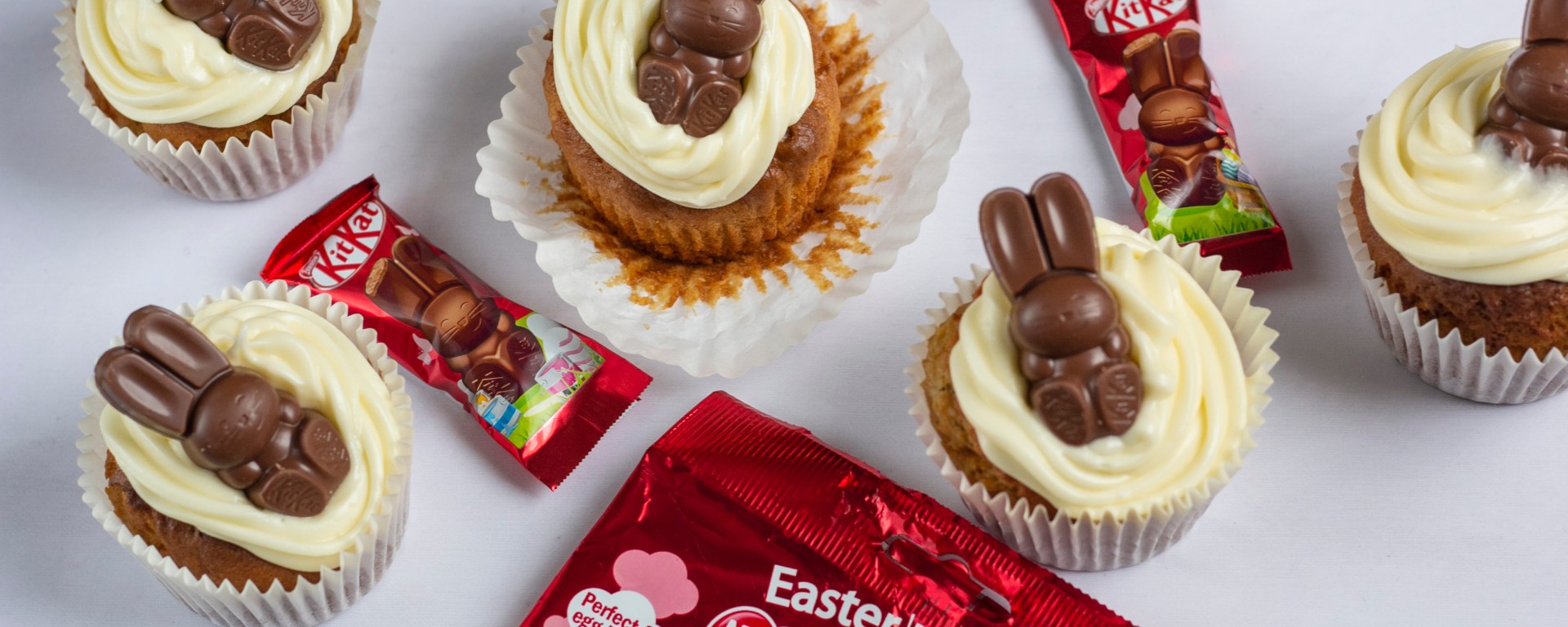- Decorate each cupcake with a Mini Kit Kat Bunny and share with your friends this Easter!